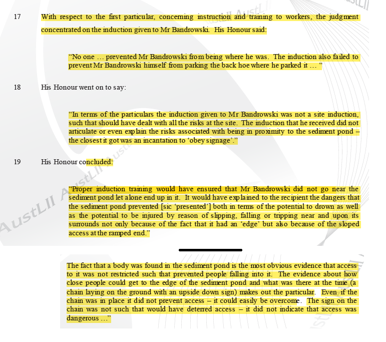 ·        “concerning instruction and training to workers, the judgment concentrated on the induction given to Mr Bandrowski. His Honour said: “No one … prevented Mr Bandrowski from being where he was. The induction also failed to prevent Mr Bandrowski himself from parking the back hoe where he parked it … “