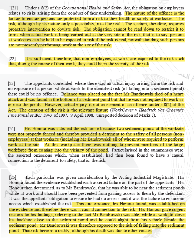 ·        The prosecution hinged specifically on the risk, rather than the death, noting “I am satisfied that the risk as alleged namely the risk that someone working in or near the sediment ponds could fall into it was a relevant risk”