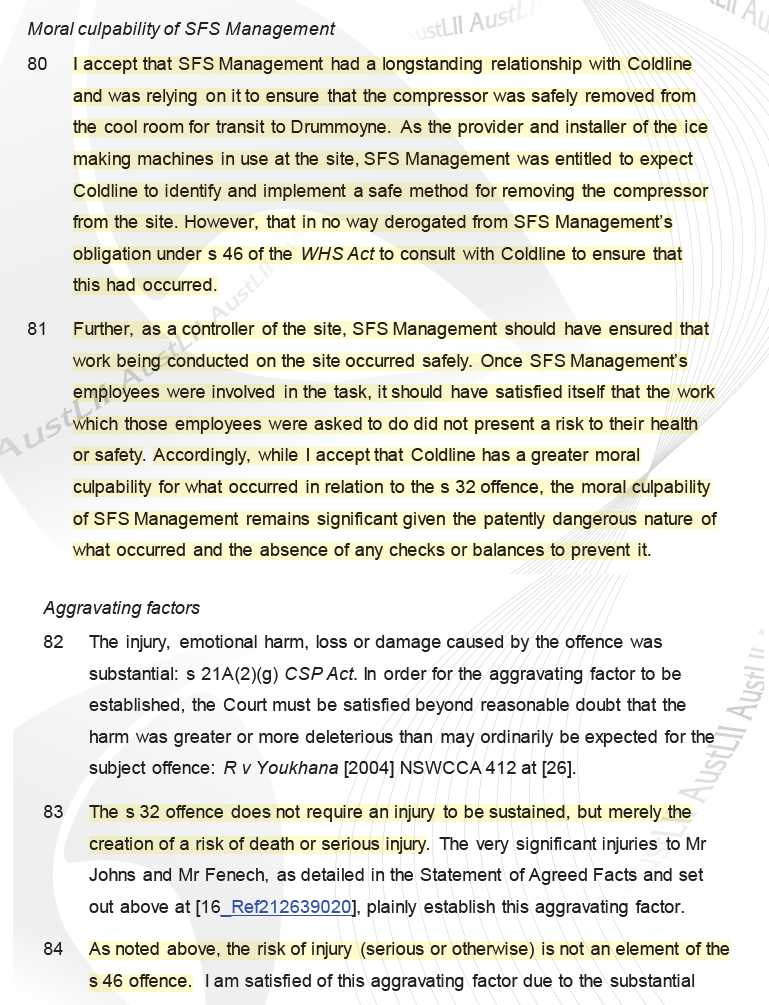 · “However, that in no way derogated from SFS Management’s obligation under s 46 of the WHS Act to consult with Coldline to ensure that this had occurred”
