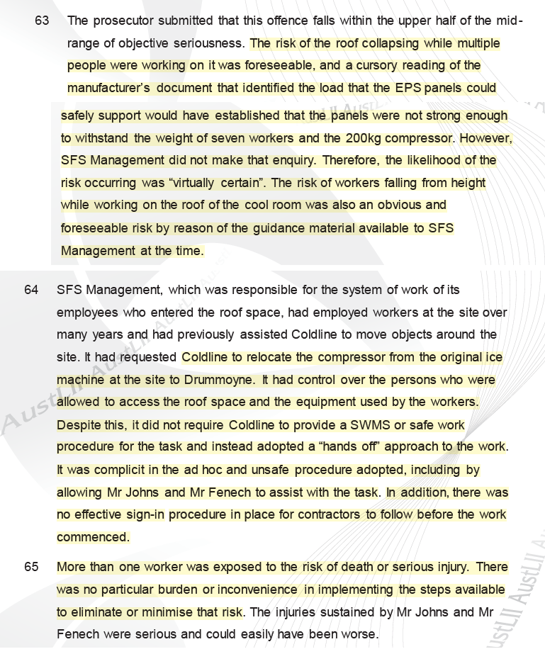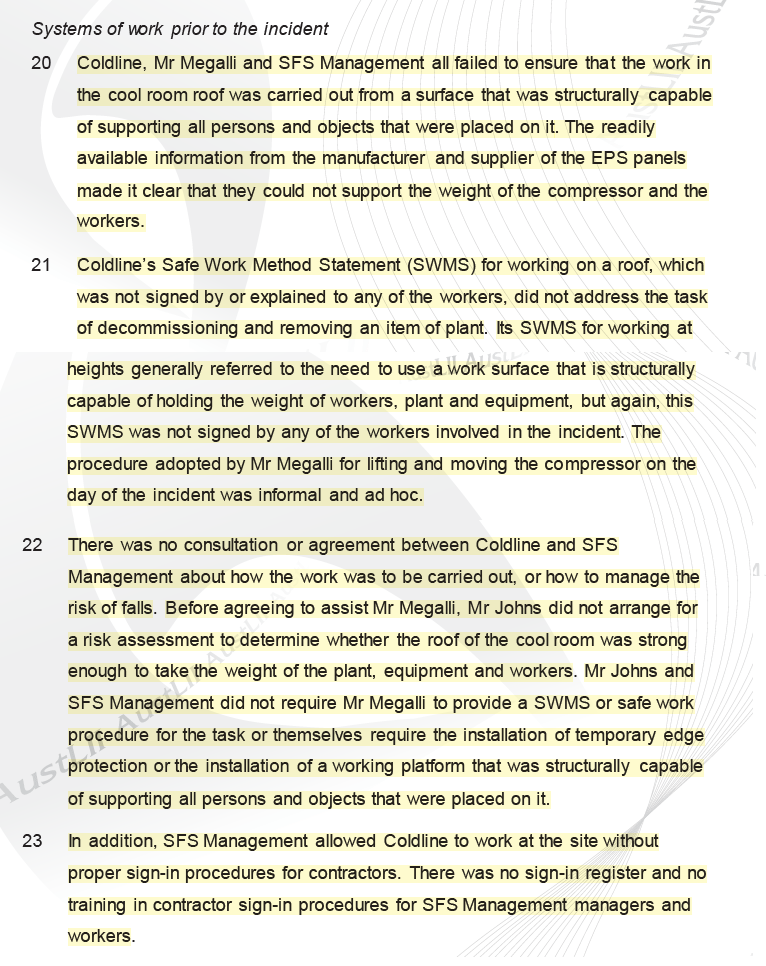 · The client “had control over the persons who were allowed to access the roof space and the equipment used by the workers. Despite this, it did not require Coldline to provide a SWMS or safe work procedure for the task and instead adopted a “hands off” approach to the work”