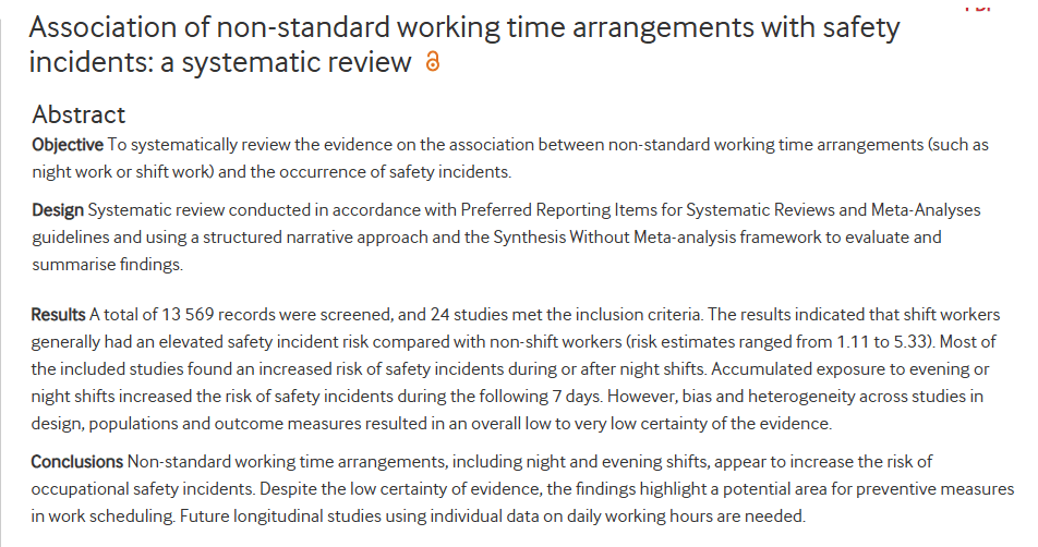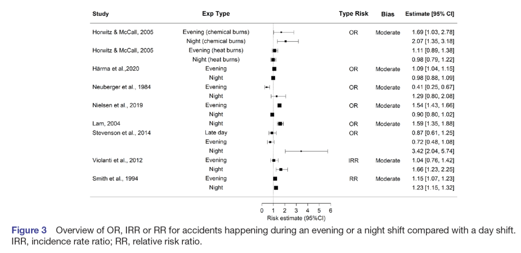 · “one study identified a significantly increased risk of incidents following an evening or night shift36 showing increased risk following night shift (OR 1.33 (95%CI 1.17 to 1.52)), but not evening shift (OR 1.01 (95%CI 0.95 to 1.07))”