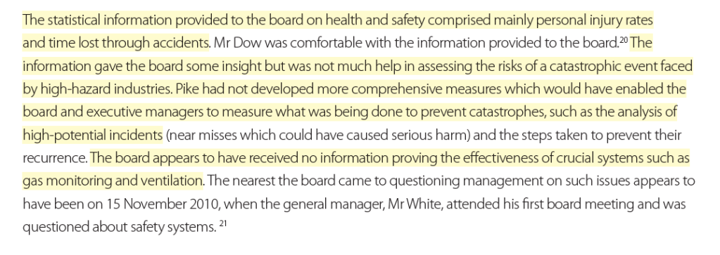 Notably, “the mine had been running for over twelve months injury free with no lost time and **there was no reason for the Board to flag any specific area that needed attention ** over and above that being directed by the managers at the mine” (emphasis added).