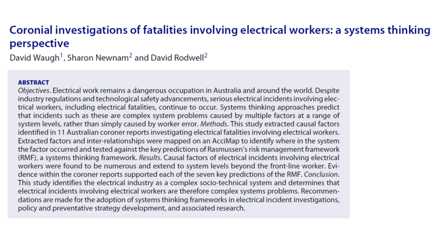 Ref: Waugh, Newnam & Rodwell (2025): Coronial investigations of fatalities involving electrical workers: a systems thinking perspective, International Journal of Occupational Safety and Ergonomics
