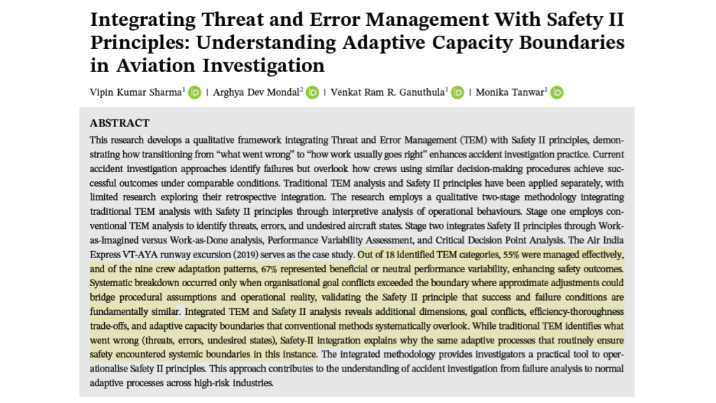 Ref: Sharma, V. K., Mondal, A. D., Ganuthula, V. R. R., & Tanwar, M. (2025). Integrating Threat and Error Management With Safety II Principles: Understanding Adaptive Capacity Boundaries in Aviation Investigation. Journal of Contingencies and Crisis Management, 33(4), e70104.
