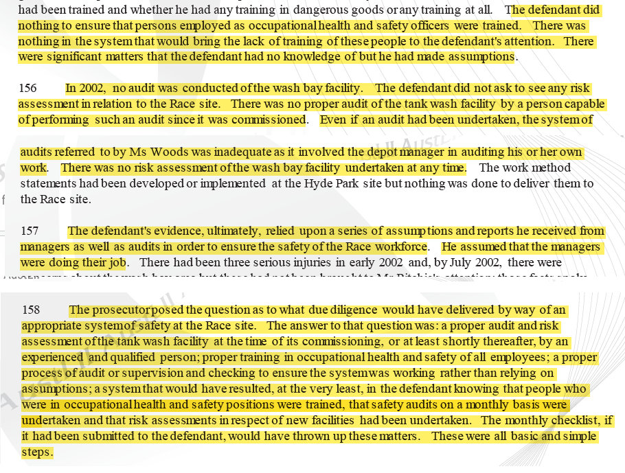 - “The prosecutor posed the question as to what due diligence would have delivered by way of an appropriate system of safety at the Race site. The answer to that question was: a proper audit and risk assessment of the tank wash facility at the time of its commissioning, or at least shortly thereafter, by an experienced and qualified person; proper training in occupational health and safety of all employees; a proper process of audit or supervision and checking to ensure the system was working rather than relying on assumptions; a system that would have resulted, at the very least, in the defendant knowing that people who were in occupational health and safety positions were trained, that safety audits on a monthly basis were undertaken and that risk assessments in respect of new facilities had been undertaken”