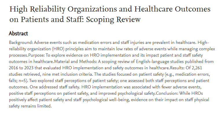 ·        “HRO implementation was associated with fewer adverse events, positive staff perceptions on patient safety, and improved psychological safety”