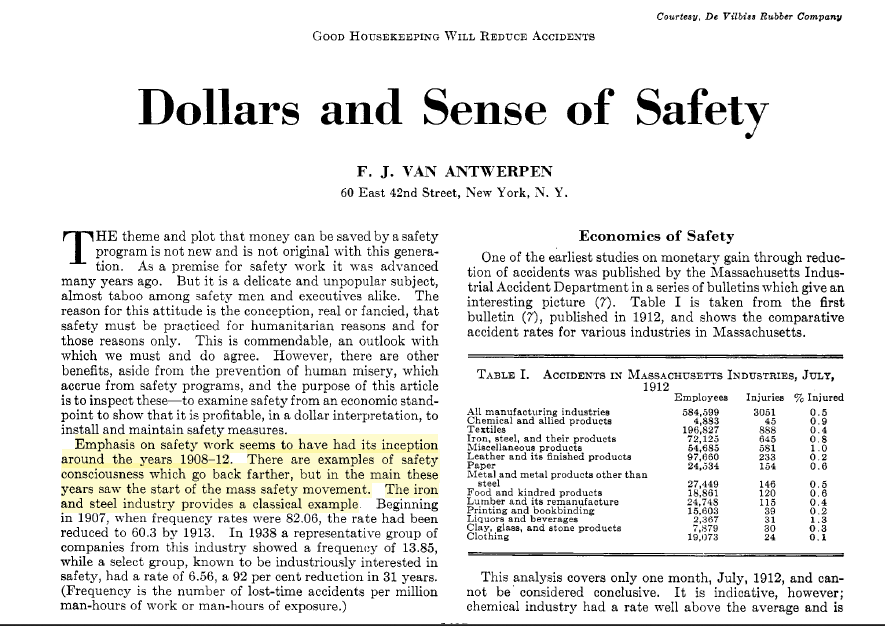 Ref: Antwerpen, F. V. (1940). Dollars and Sense of Safety. Industrial & Engineering Chemistry, 32(11), 1437-1444.