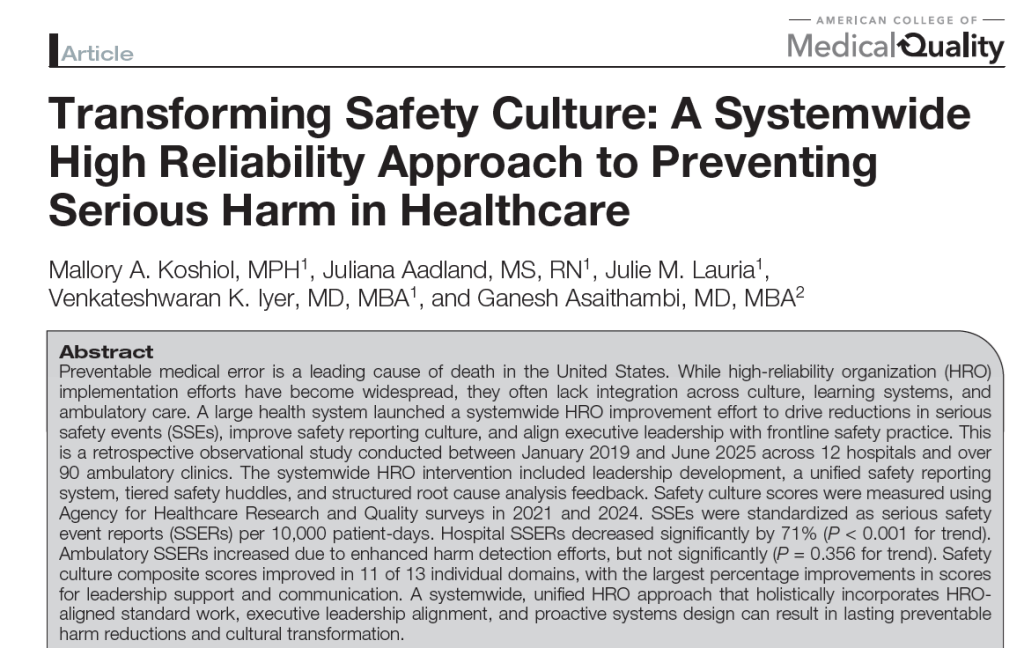 · “A systemwide, unified HRO approach that holistically incorporates HRO-aligned standard work, executive leadership alignment, and proactive systems design can result in lasting preventable harm reductions and cultural transformation”