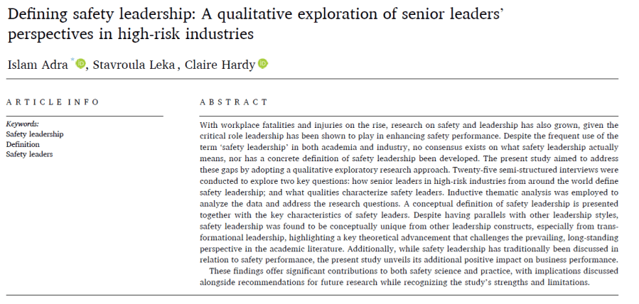 · ”Some participants viewed safety leadership as a component of overall leadership, arguing that effective leaders inherently prioritize safety. Others, however, identified three key distinctions that set it apart as a unique style. Those linking safety leadership to general leadership often cited qualities like care and authenticity as common denominators”