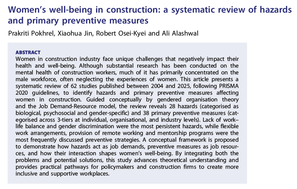 This systematic review unpacked 62 studies looking at women’s well-being in construction, and key hazards and prevention measures.
