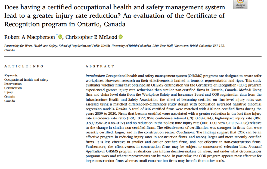 Here’s another study which explored these links – this time using the Canadian Certificate of Recognition (COR) program.