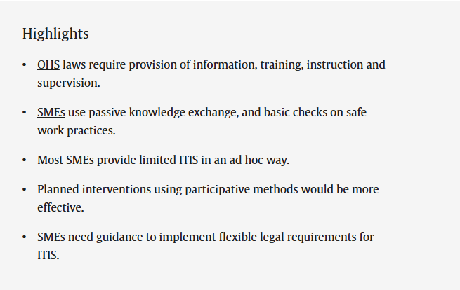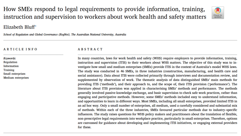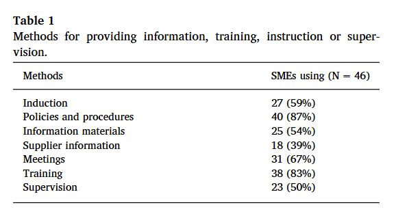 Ref: Bluff, E. (2019). How SMEs respond to legal requirements to provide information, training, instruction and supervision to workers about work health and safety matters. Safety science, 116, 45-57.
