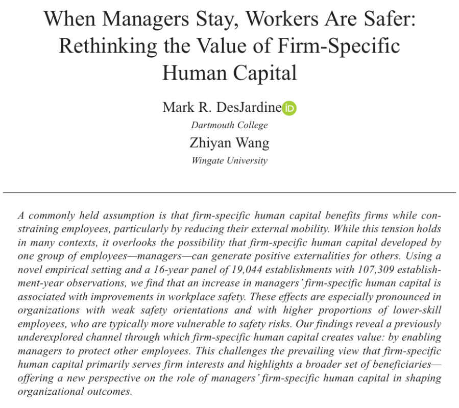 Ref: DesJardine, M. R., & Wang, Z. (2025). When Managers Stay, Workers Are Safer: Rethinking the Value of Firm-Specific Human Capital. Journal of Management, 01492063251358215.