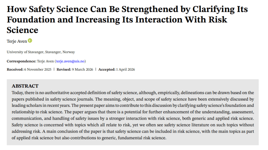 Ref: Aven, T. (2026). How Safety Science Can Be Strengthened by Clarifying Its Foundation and Increasing Its Interaction With Risk Science. Risk Analysis: an Official Publication of the Society for Risk Analysis46(5), e70244-e70244.